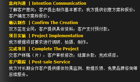 保證力——作業(yè)流程 我們一直相信,只有科學、規(guī)范的作業(yè)流程作為運作保障,優(yōu)秀的創(chuàng)意才能得以完美的實施。在經(jīng)典影視,我們一直秉承——策略精準 . 創(chuàng)意新銳 . 執(zhí)行出色。